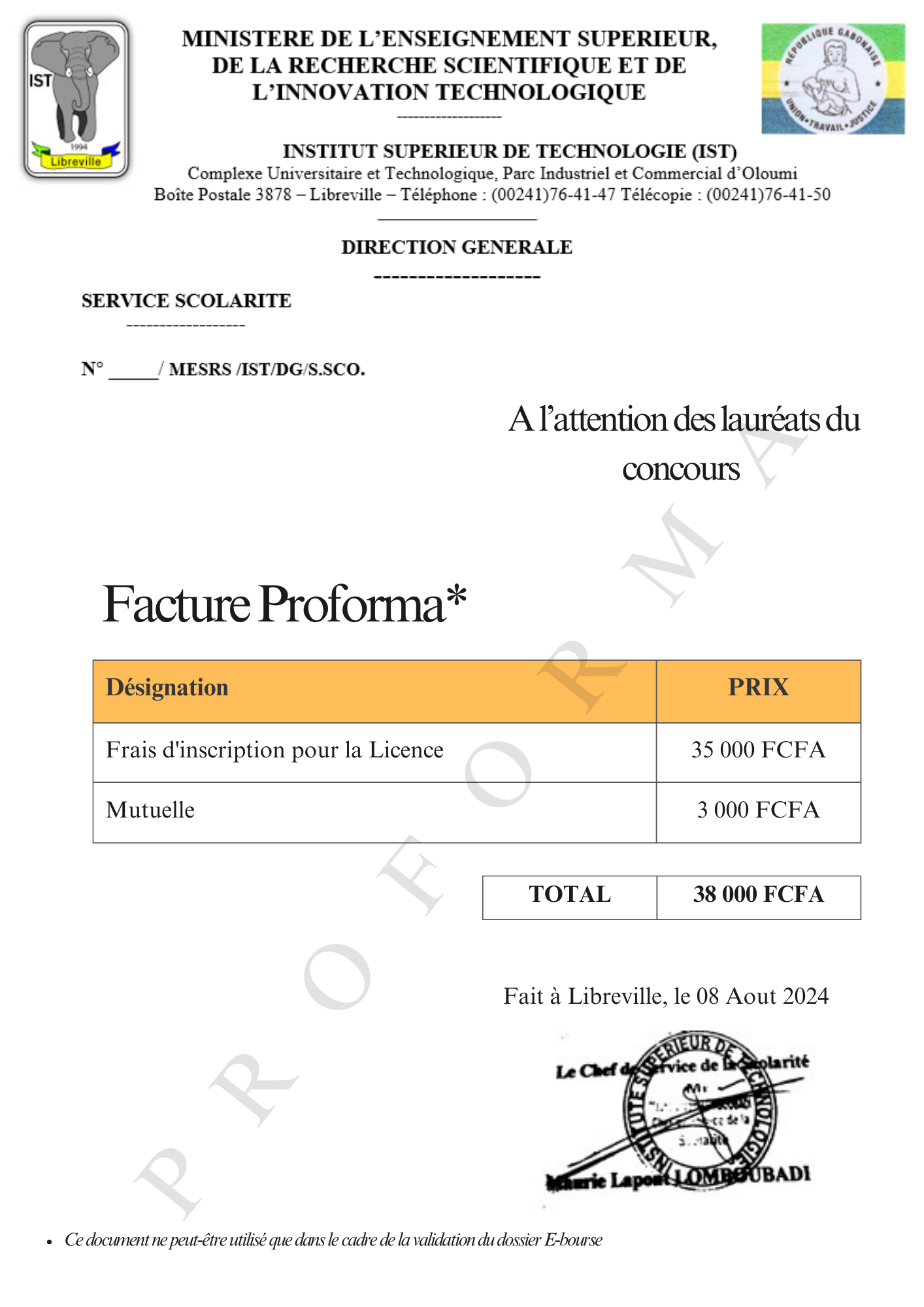 Chers étudiants, veuillez télécharger la facture proforma au format image pour la Licence et la joindre à votre dossier e-Bourse.